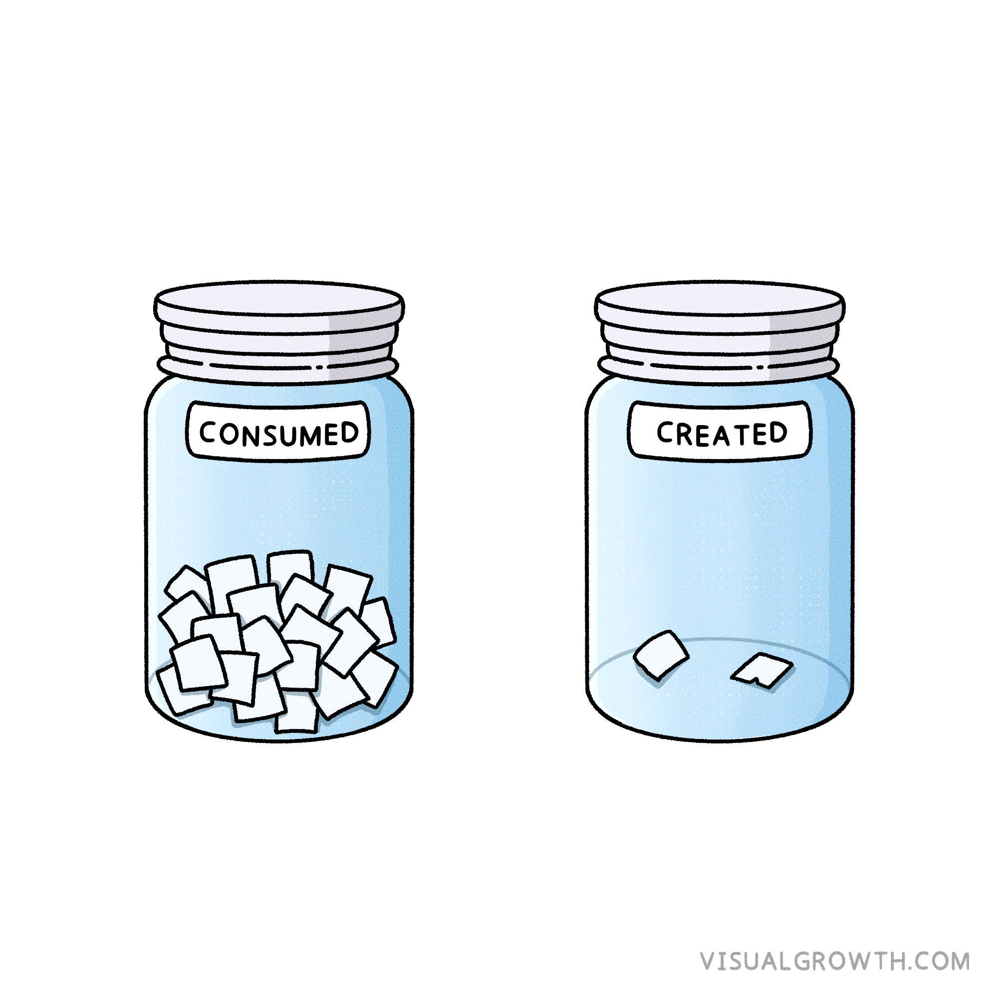 Whenever I consume significant content, I jot down a note on a post-it and drop it into one jar. Conversely, every time I create something noteworthy, it goes into a different jar.