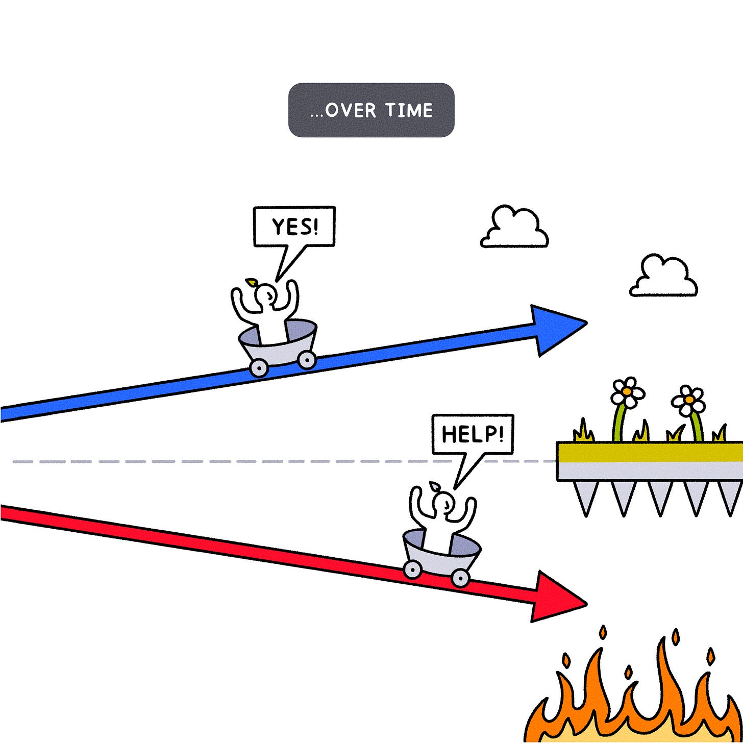To reorient myself toward my values and reignite my sense of purpose, I decided to refresh my Personal Compass - a simple one-page document outlining my long-term mission and specifying what I am willing to compromise versus what I am not. In addition to revising it, I set a reminder to check it daily so I wouldn’t forget why I’m doing what I’m doing. I soon started to spot and correct certain patterns in my behavior that weren’t aligned with my goals. Just because you can doesn’t mean you should. When facing important decisions with momentous decisions, it is crucial to consider all relevant factors, as money is just one aspect. Other factors such as time, energy, enjoyment, impact, and longevity must also be weighed. Also, I figured out that if I like a certain idea but hate doing some of the necessary work to make it happen, I could collaborate with folks who actually enjoy that kind of work.